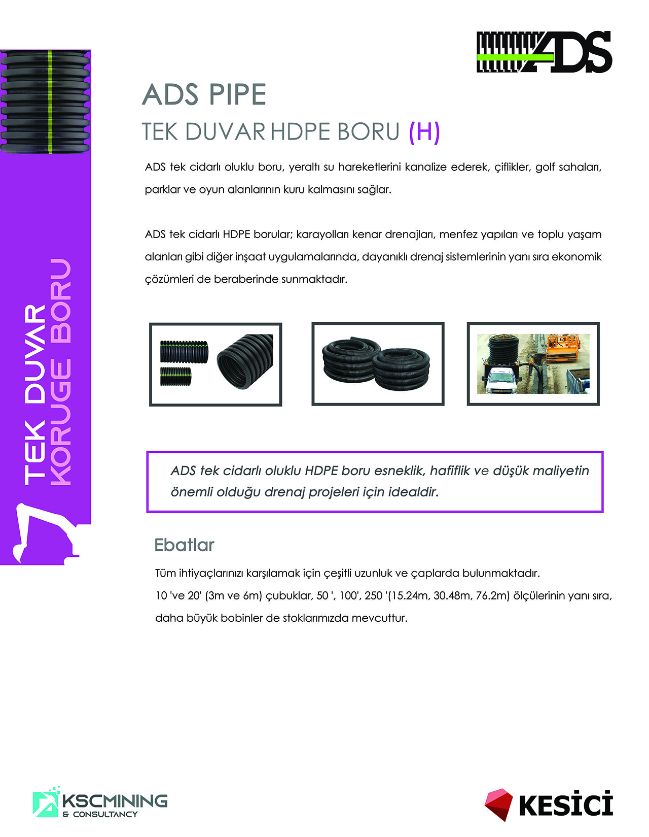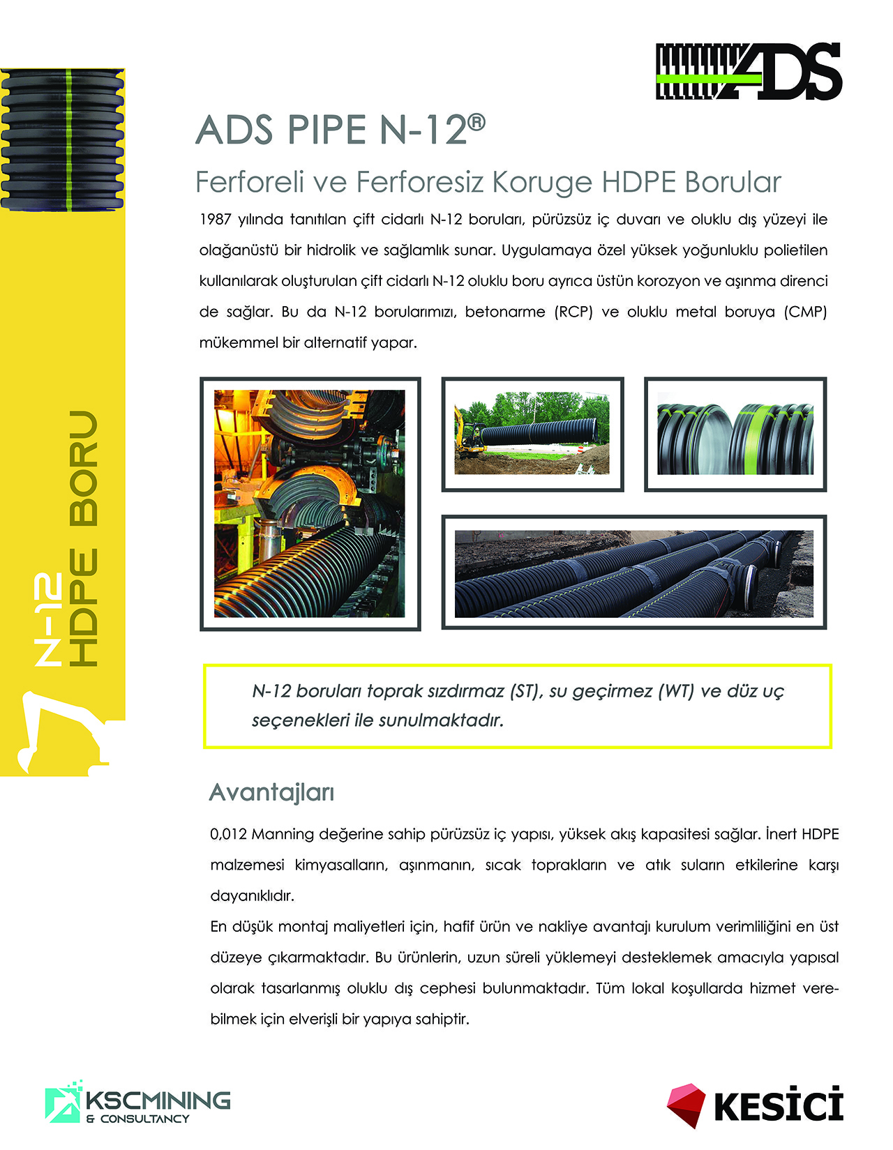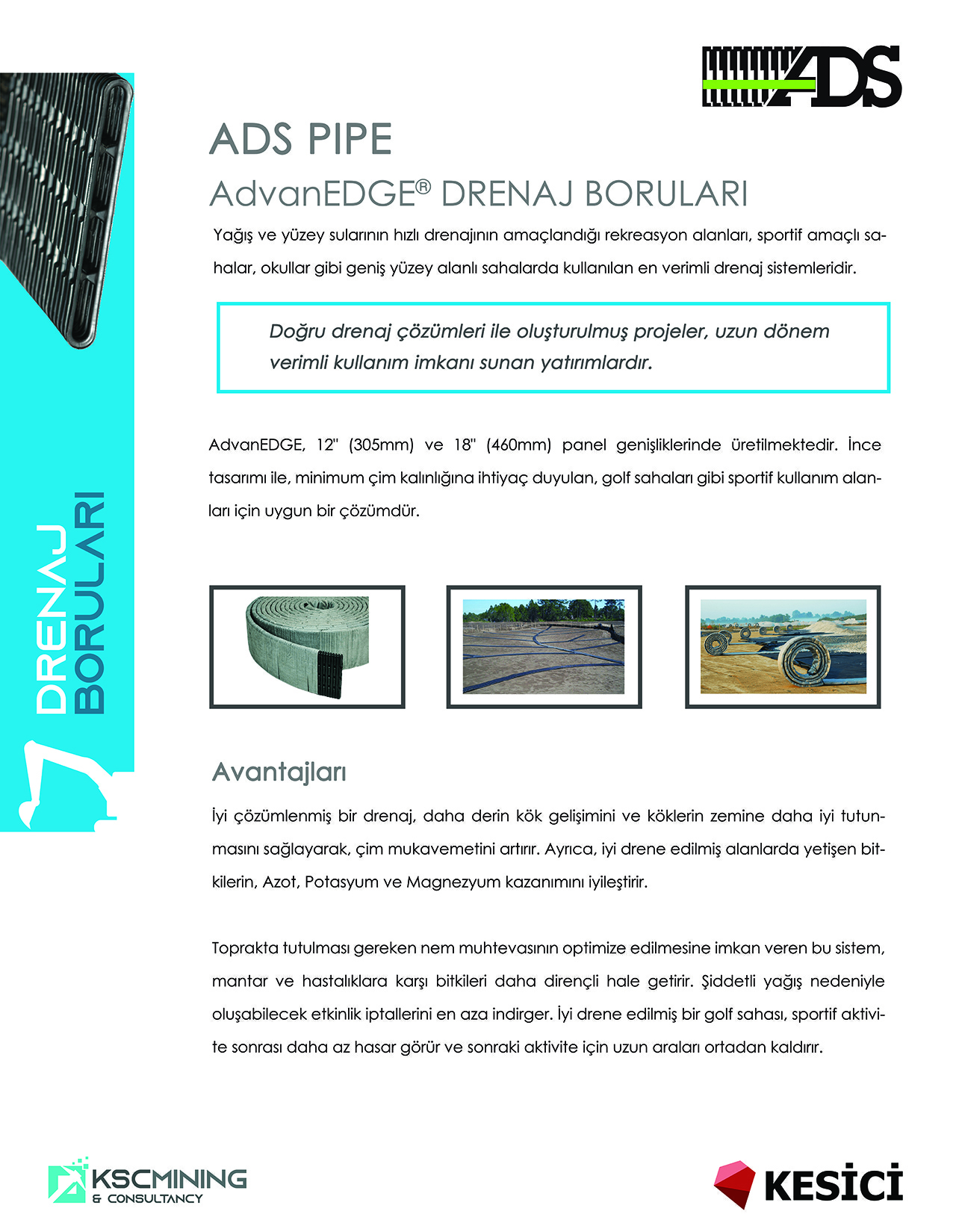 Advanced Drainage Systems, dünya çapında çok şey beklenen ve sürekli değişen madencilik pazarına yönelik boru ve tesisat tasarımları geliştirmektedir. ADS, madencilik uygulamalarında gereken özenli yükleme ve kimyasal ortamlarda iyi performans gösteren ürünlerin tedarikinde yaklaşık 50 yıllık tecrübeye sahiptir.